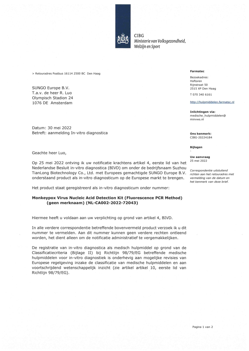 目前,天隆猴痘病毒檢測試劑已取得歐盟CE及英國MHRA注冊,廣泛應(yīng)用于國內(nèi)多省、市疾控中心及海關(guān)檢驗等單位,守護國門安全和國民健康;同步為西班牙、沙特、韓國、約旦、印尼、希臘等10余個海外國家提供服務(wù),在更廣范圍內(nèi)書寫科技服務(wù)人類健康的新篇章,為全球公共衛(wèi)生事件防控貢獻中國智慧和方案。