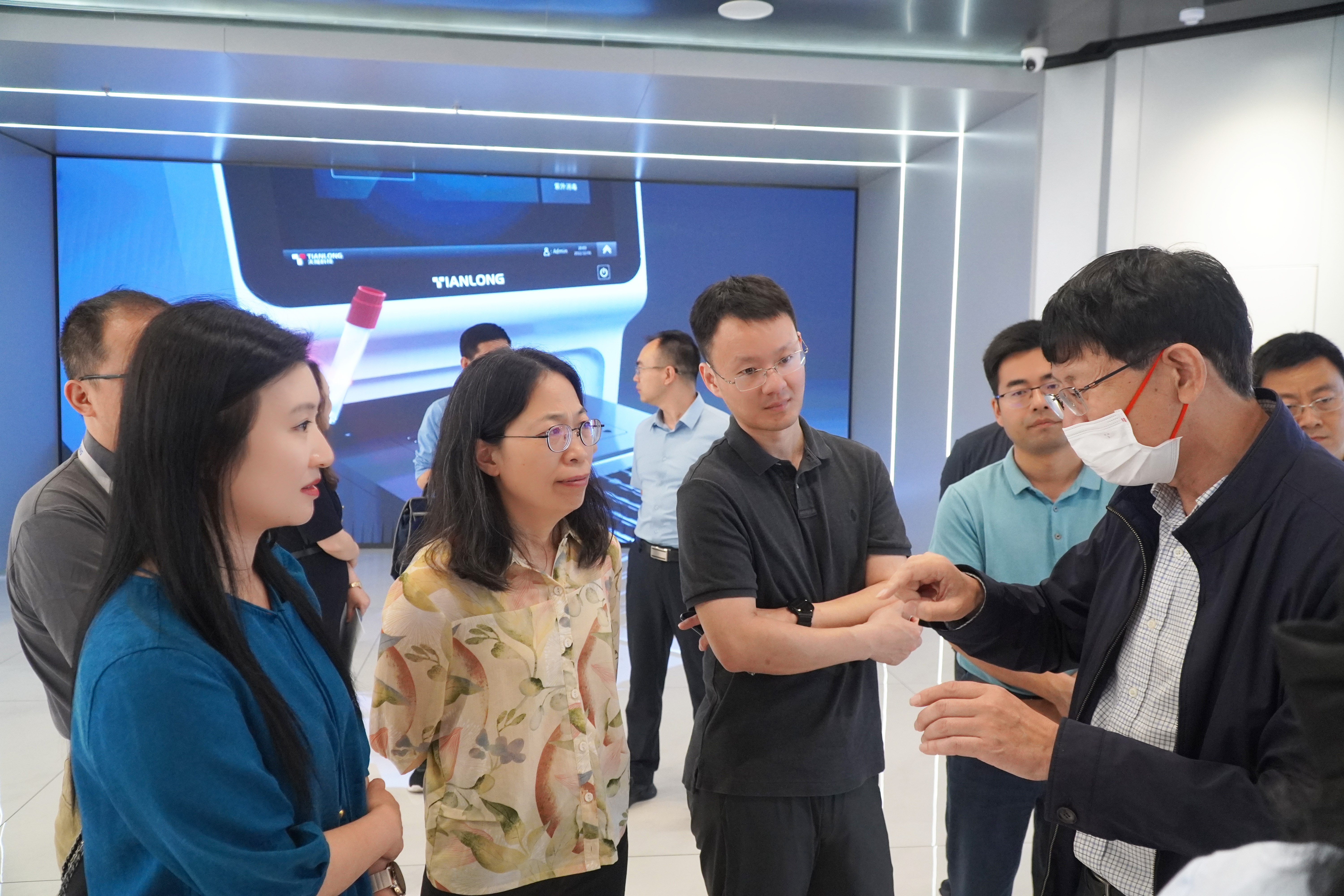 調(diào)研過程中,近期入選中關(guān)村論壇“十大首發(fā)高端創(chuàng)新產(chǎn)品”的天隆Panall 8000全自動分子診斷系統(tǒng)因其集約高效、操作便捷、多重聯(lián)檢、多重防護(hù)的特點(diǎn)吸引了調(diào)研組駐足參觀與交流。彭年才教授及公司相關(guān)人員向調(diào)研組詳細(xì)介紹了Panall 8000獲證情況、操作方法、用途領(lǐng)域等。李靜莉所長一行對天隆科技的發(fā)展成就、科創(chuàng)能力等給予了充分肯定,她表示,天隆科技擁有的多項(xiàng)自主知識產(chǎn)權(quán)及完善的產(chǎn)品體系對于醫(yī)療行業(yè)升級發(fā)展及實(shí)現(xiàn)我國高端醫(yī)療設(shè)備自主可控等都具有重要意義,期待天隆科技可以持續(xù)技術(shù)創(chuàng)新,繼續(xù)引領(lǐng)行業(yè)高質(zhì)量發(fā)展。